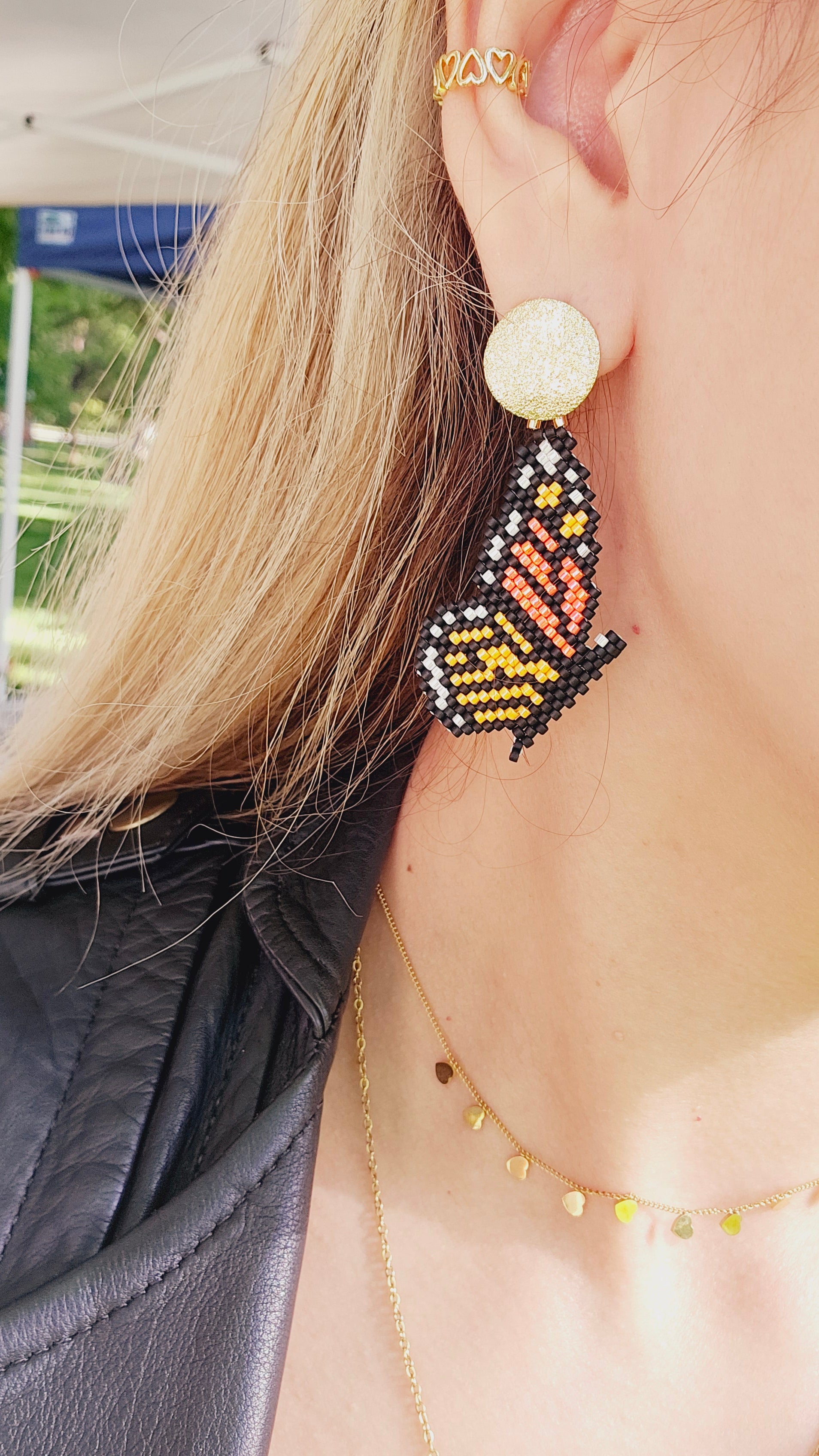 These Monarch wings beaded earrings are handcrafted with delicate miyuki beads to mimic the beauty of butterfly wings. Each pair is unique, as the additional accents vary depending on availability. Bring a touch of nature and elegance to any outfit.