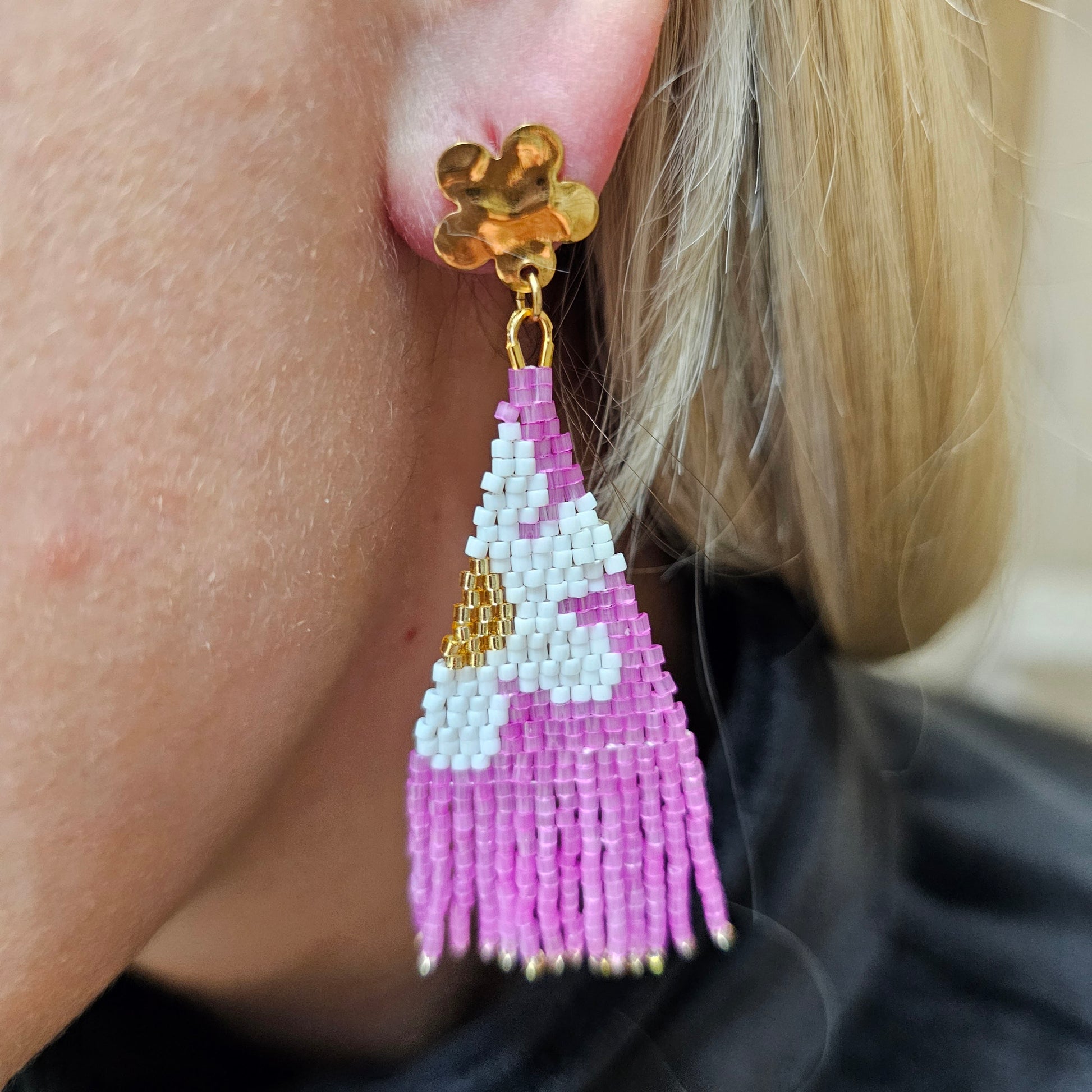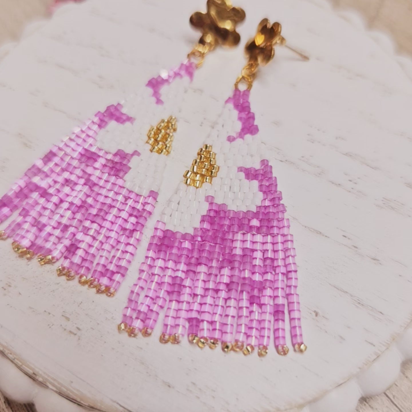 Radiant Blossom is expertly crafted with shimmering iridescent satin miyuki beads, forming a stunning flower design separated by half. These fringe earrings add a touch of elegance to any outfit and are perfect for any occasion. Elevate your look with Radiant Blossom.